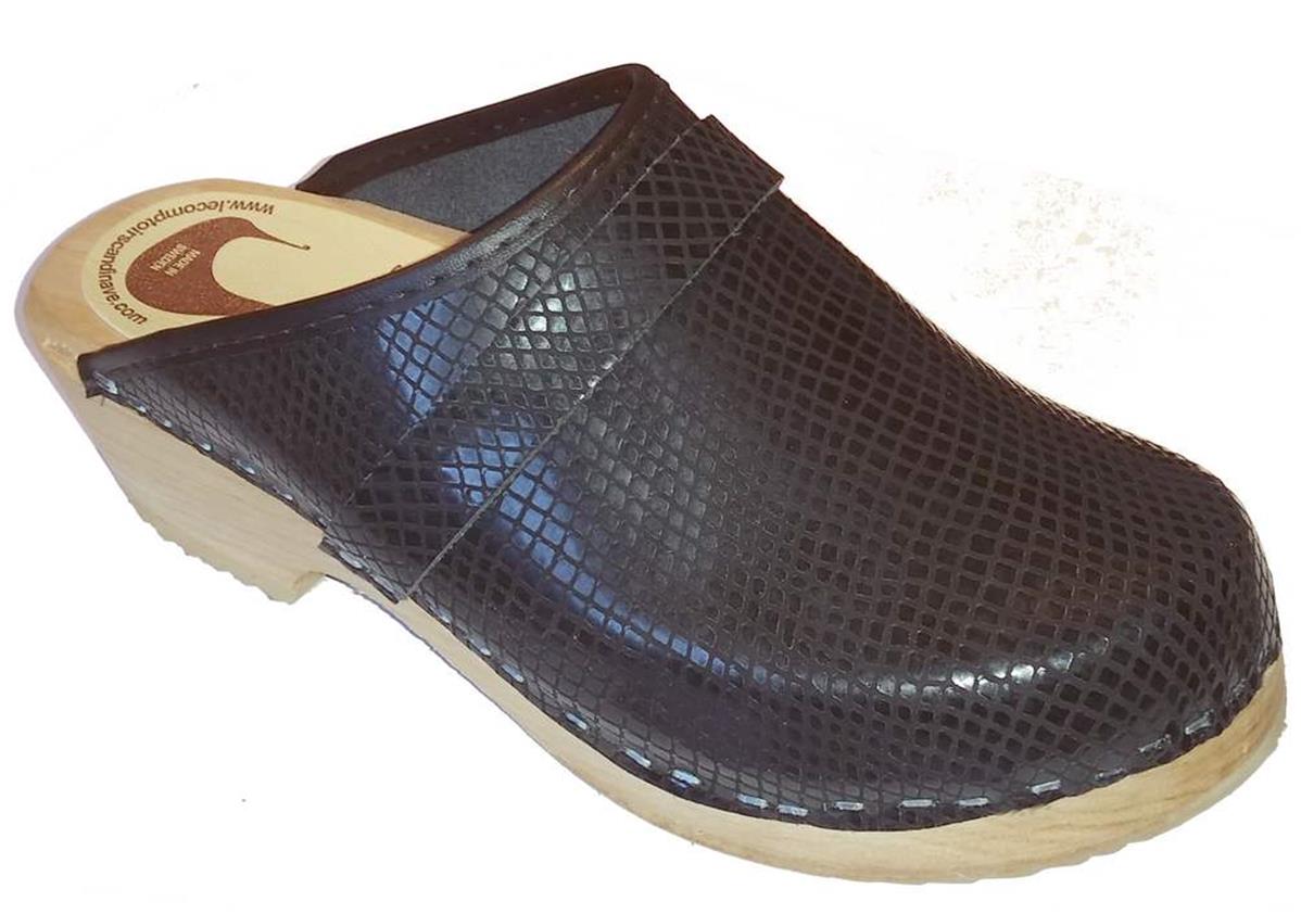 Tige en cuir souple noir à relief agrafé sur la semelle bois.
